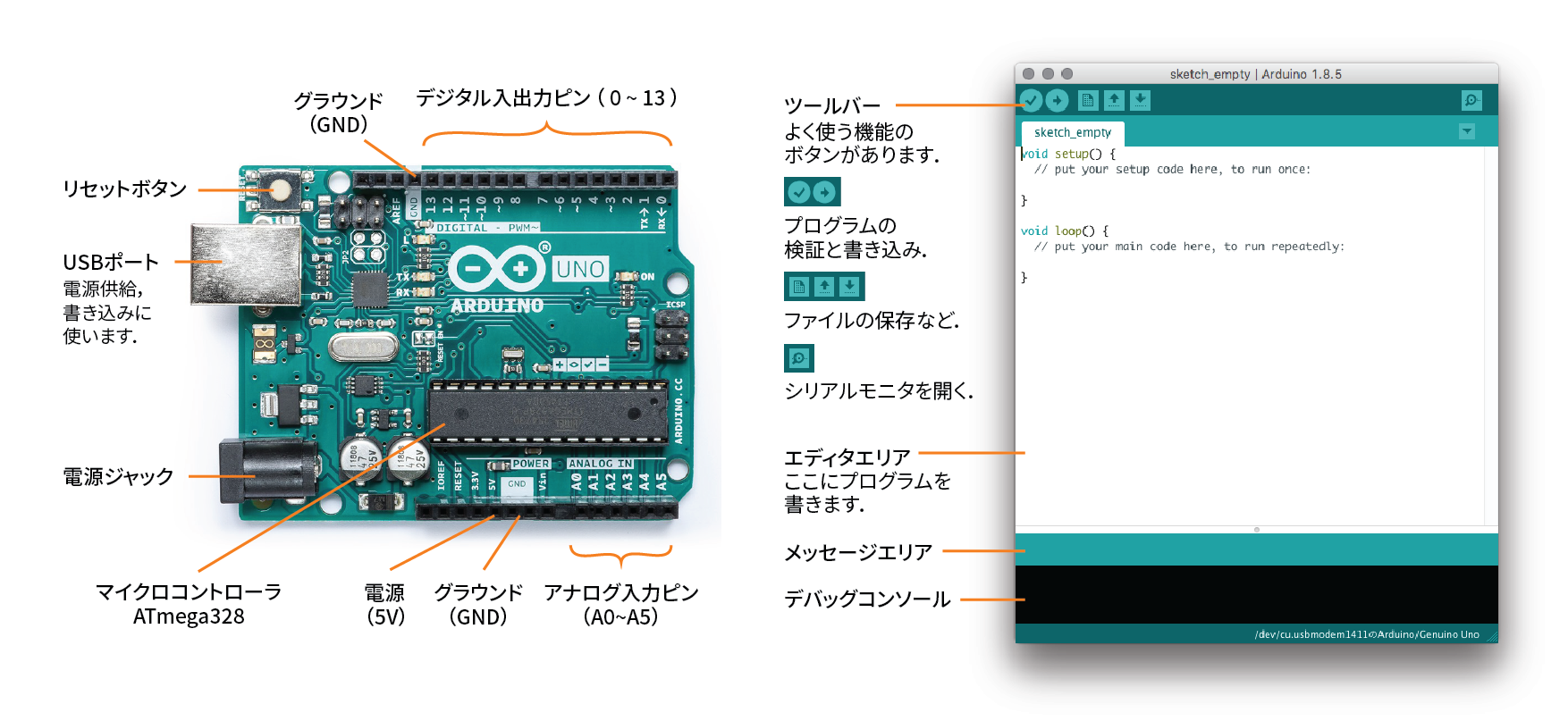 Arduinoには,性能や大きさによって様々な種類がありますが,このワークショップでは最も一般的なArduino Unoを使います.購入する場合は,周辺機器が揃っているArduinoをはじめようキット - SWITCH-SCIENCEなどがおすすめです.Arduino IDEは,こちらからダウンロードできます.(8/23追記)
