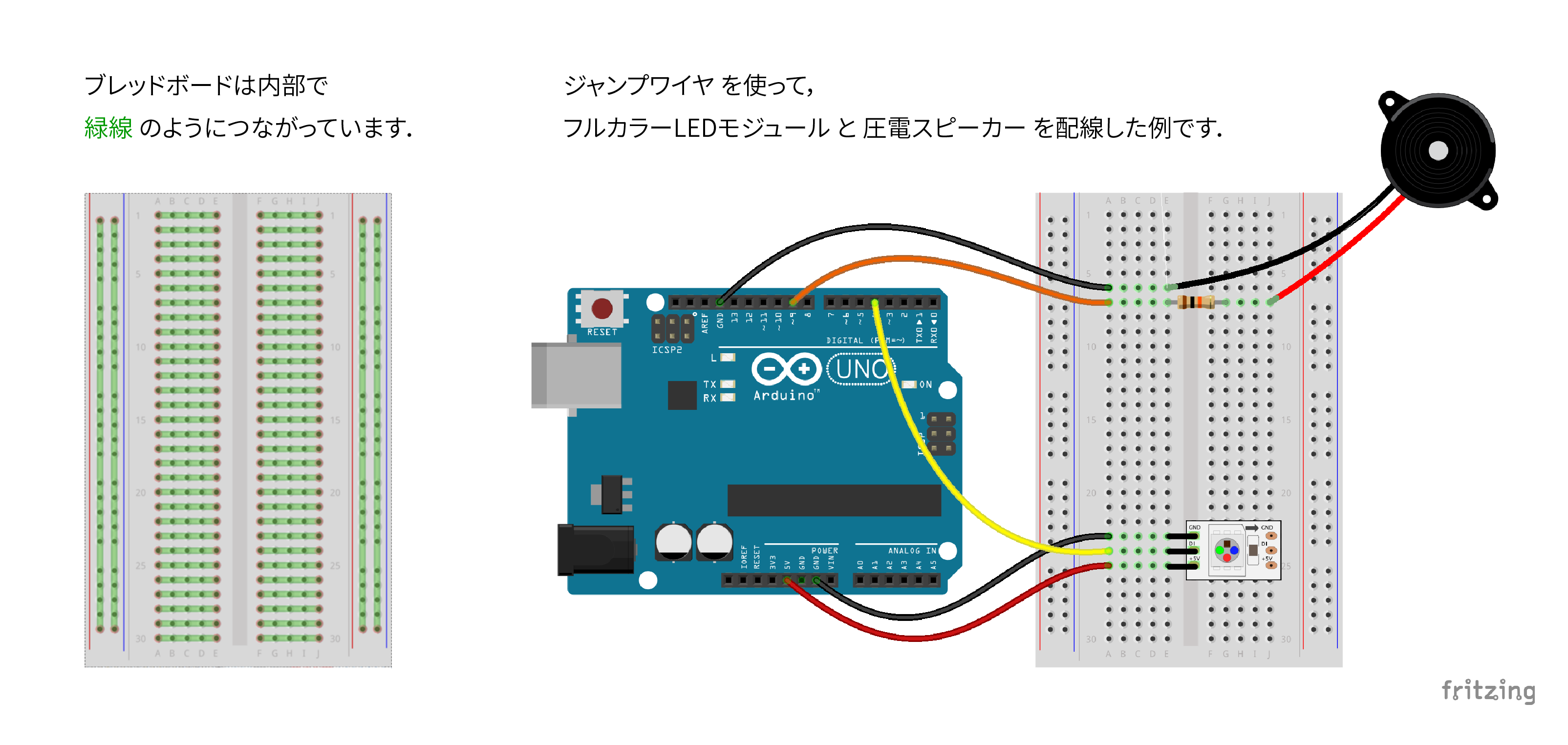 Arduinoのピンに様々な電子部品を差し込んで,プログラムで制御できる電子回路を組むことができます.ブレッドボードやジャンプワイヤを使って,半田づけをする必要なく,電子回路を試すことができます.プログラムでも電子回路でも,何度も試作を繰り返して,物を作っていく手法をプロトタイピングといいます.