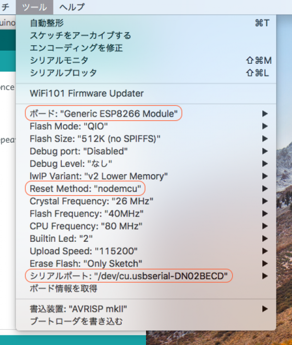 プログラムが変更できたら,メニューバーの[ツール]を開いて,ボードやシリアルポートの設定が以下のようになっているか確認して,ESP8266にArduinoプログラムの書き込みを行いましょう.Arduino Unoよりも時間がかかるので注意してください.